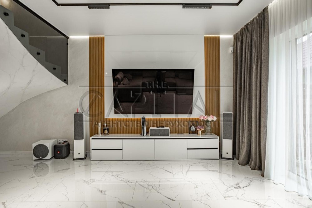 На першому поверсі розміщена простора кухня-студія, що поєднана з вітальнею, санвузол з душовою кабіною, окрема пральня, а також гардеробна. Із задньої частини будинку є вихід у приватний двір – ідеальне місце для відпочинку на свіжому повітрі або барбекю з друзями.