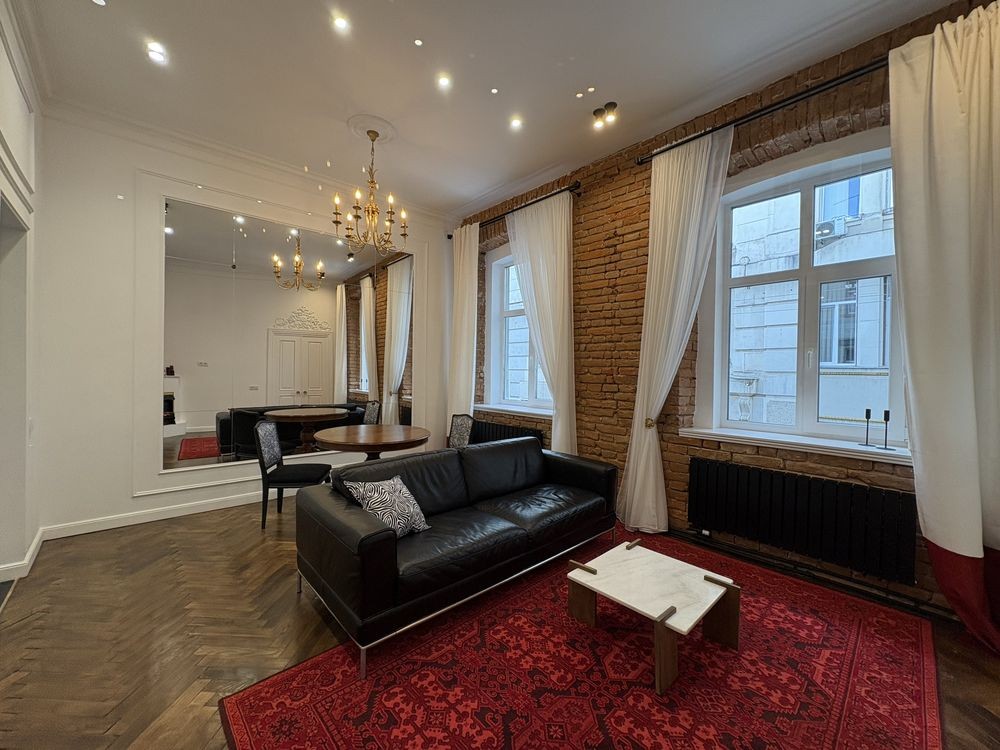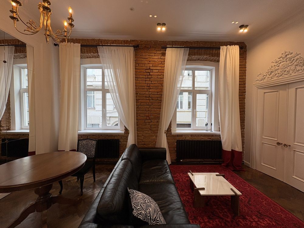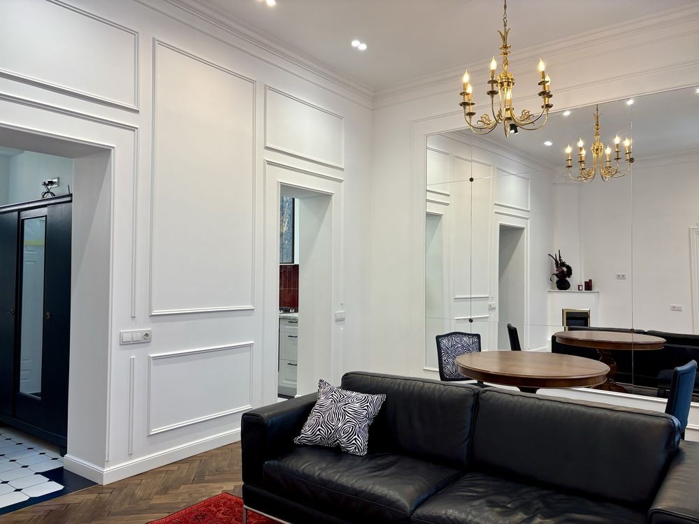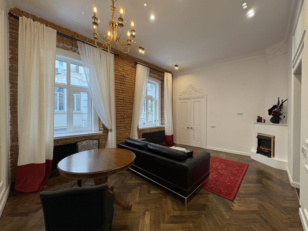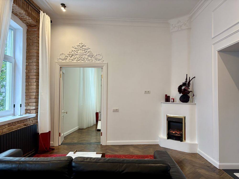 У просторій вітальні є зона їдальні ,електричний камін, дзеркало на всю стіну та автентична люстра 18 століття.
