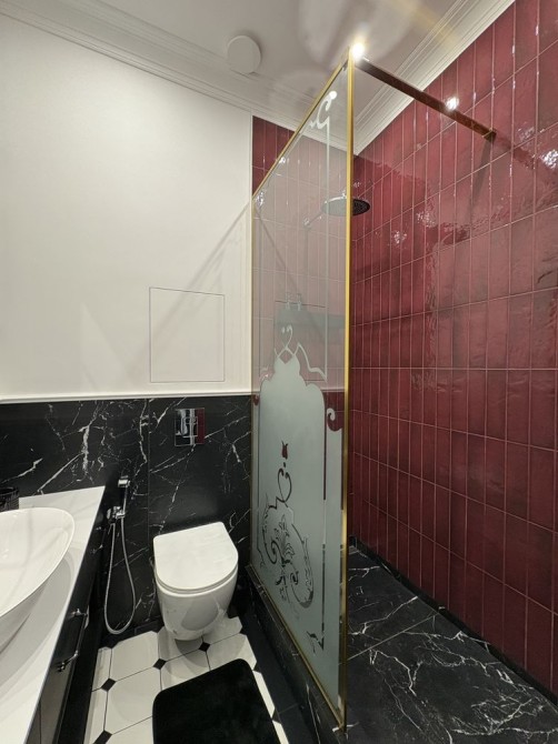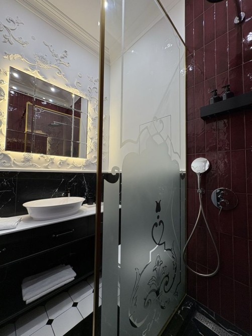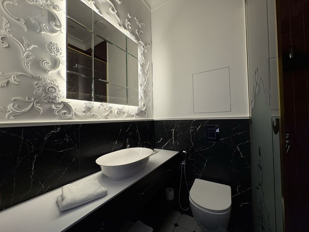 Ванна кімната має душову з тропічним душем, інсталяцію, гігієнічний душ, автономну рушникосушку, дизайнерське дзеркало.