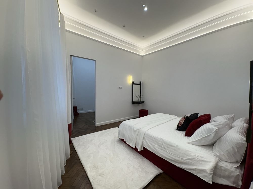 Спальня має двоспальне ліжко, відреставровані антикварні тумби, туалетний столик.