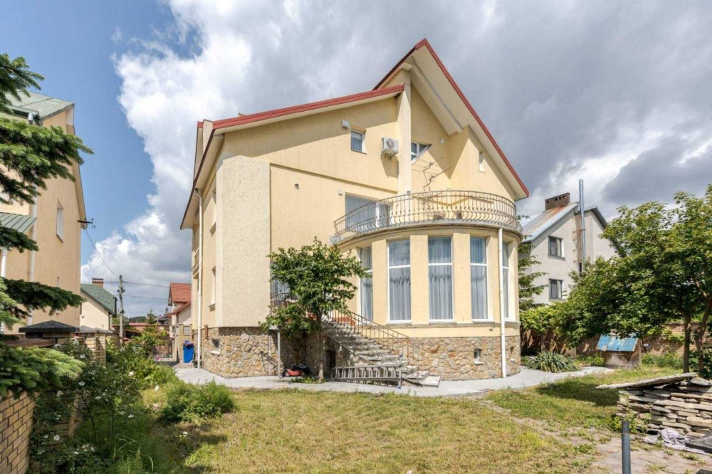 Загальна площа 579,2 м.кв., житлова 217,3 м.кв., кухня 32.6 м.кв. Будинок вирішений в світлих тонах, просторий та затишний. Стіни сходової клітини обличковані білим мармуром. Кухня сучасна і продумана, є прекрасні потужні витяжки, вся техніка абсолютно нова. В їдальні стоїть вінтажний стіл зі стільницею з італійського зеленого мармуру.