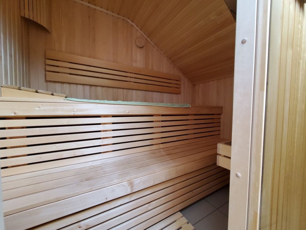 На проміжному поверсі (над гаражем) санвузол, гардеробна та сауна.