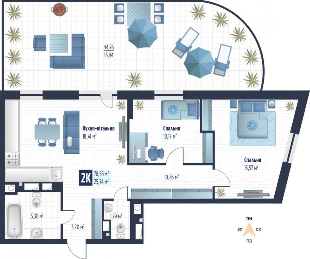 Загальна площа — 78.55 м², житлова — 25.74 м², кухня — 18.74 м².