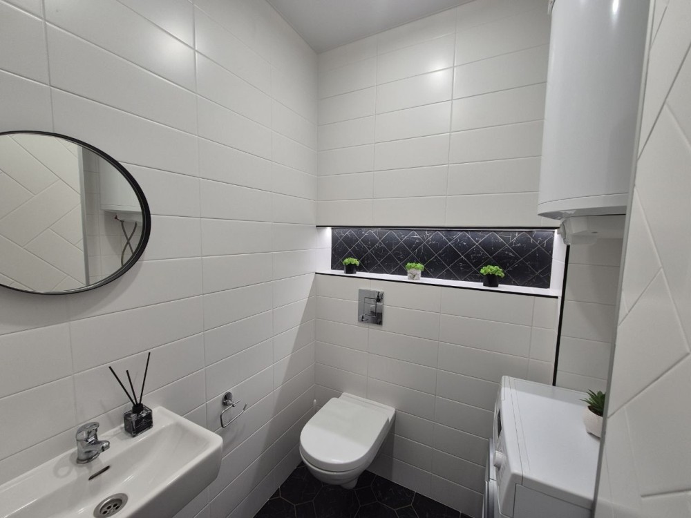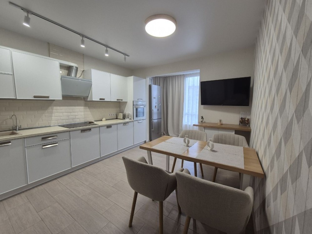 Квартира повністю укомплектована всією необхідною технікою та меблями: кондиціонер, телевізор, холодильник, мікрохвильовка, духовка, електроплита, витяжка, посудомийна машина, пральна машина, фільтр на питну воду, бойлер на 100л, електрична сушарка для рушників, гігабітний роутер заживленний через мініупс