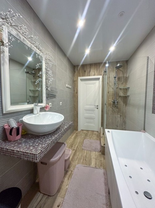 Санузел оборудован и душевой кабиной, и ванной, что добавляет дополнительный комфорт и удобство.