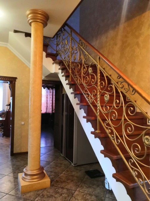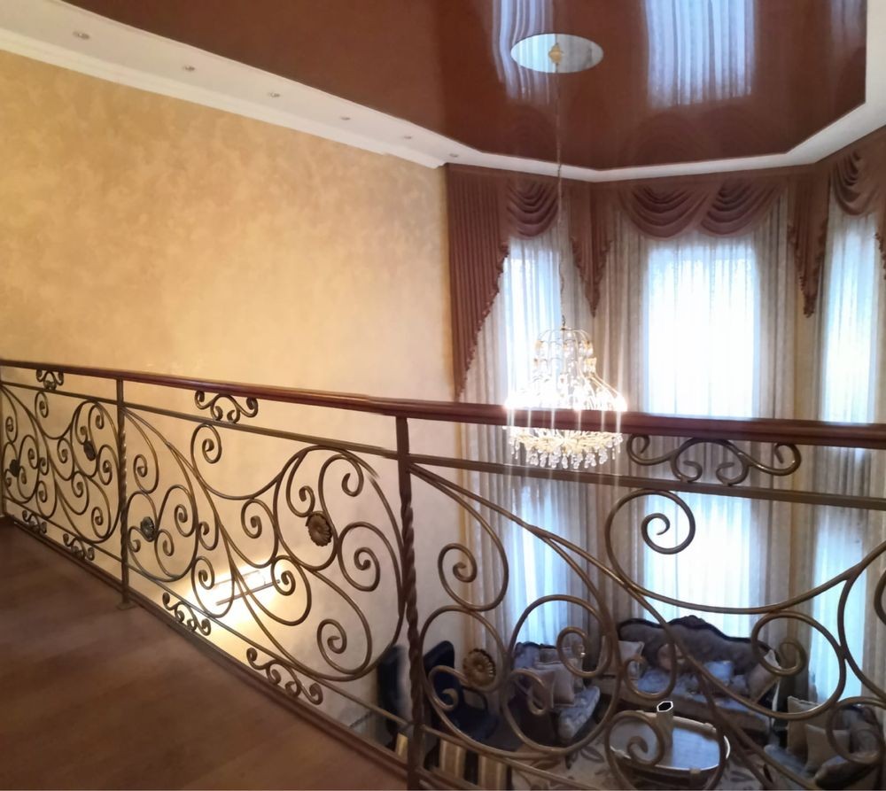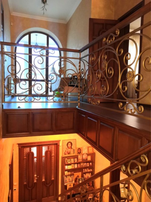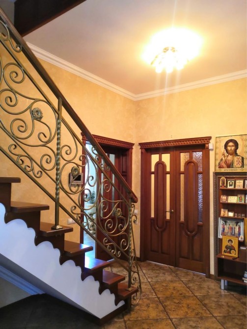 На 1 этаже расположены. Большая гостиная комната совмещенная с кухней, камин. Уютная зала с витражными окнами. Кабинет. Ванная комната.