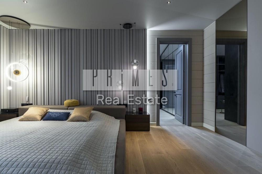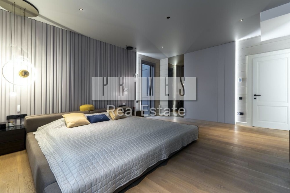перший поверх — простора кухня-вітальня площею 85 м² із другим світлом, виходами на тераси та каміном, головна спальня з власним санвузлом і гардеробом, дитяча кімната, ванна, гостьовий санвузол, пральня та технічне приміщення з окремим входом.
