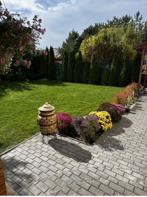 Встроенный Гараж + Большой навес на Два авто. Участок 5 соток земли- кадастровый номер. Ухоженная придомовая территория - елочки, хвойники, цветники.