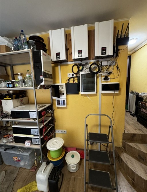 Первый этаж - пол тёплый. Прихожая. Просторная Кухня - студия с выходом на террасу. Отдельная комната- рабочий кабинет. Бытовая комната - Газовый котёл и Акамуляторы на 15 квт. с установленной системой. Сан. узел с душевой кабиной.