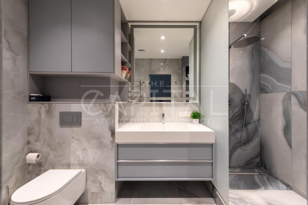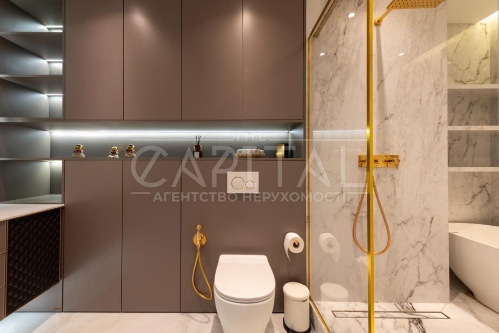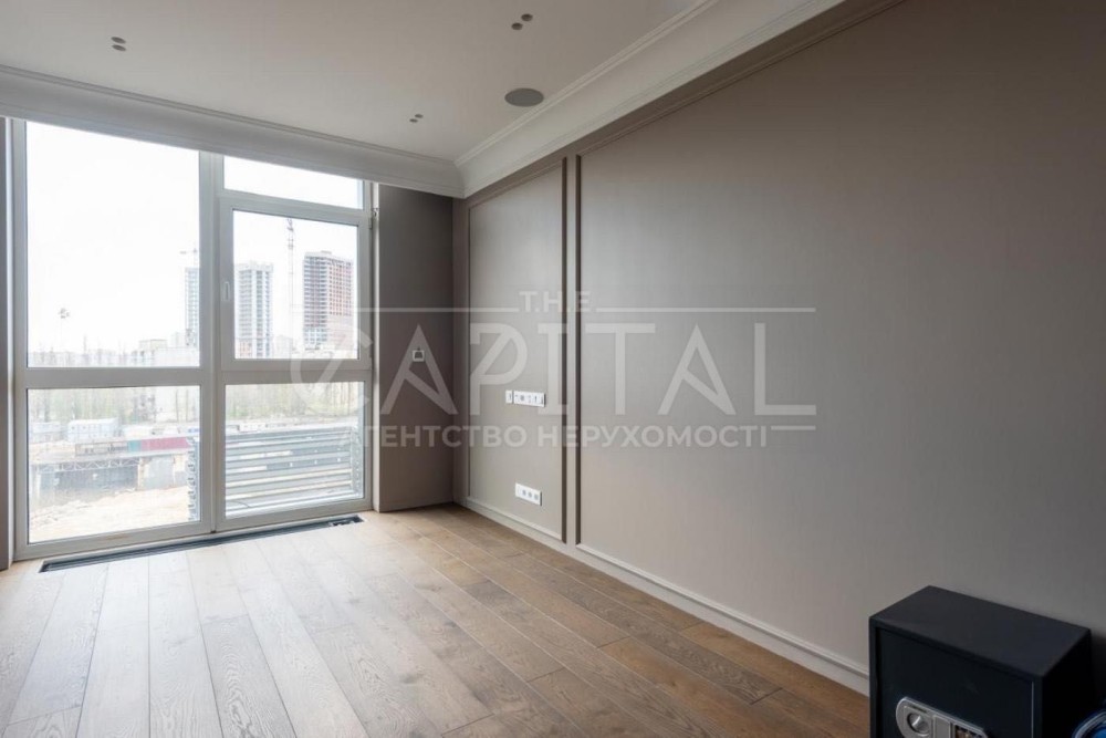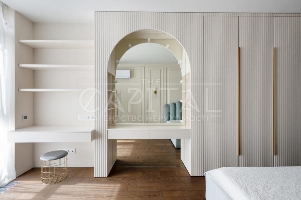 велика кухня поєднана з вітальнею, master bedroom з власною розкішною стильною гардеробною кімнатою та санвузлом, дві додаткові спальні (дитяча, гостьова, додаткова гардеробна, тощо), кабінет, всього в квартирі три с/в, пральна кімната, просторий передпокій.