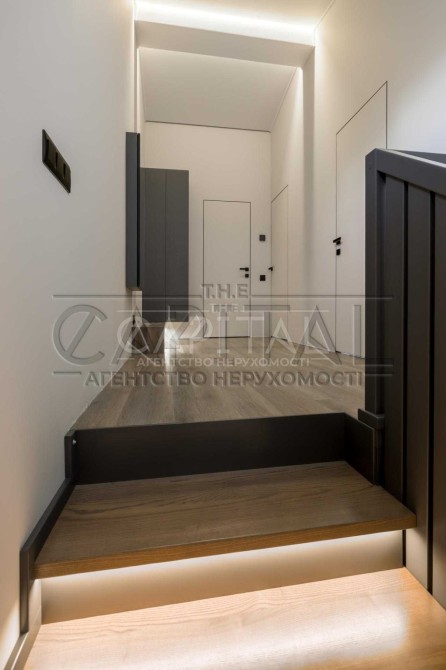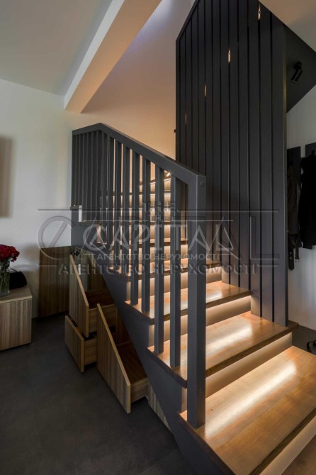 Сходи виготовлені з цільного ясеня товщиною 4 см на металевому каркасі. LED-підсвітка кожної сходинки вмикається датчиками руху або через настінний вимикач
