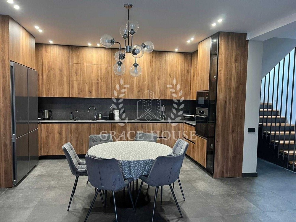Построен из цегли, утеплен минватой, бетонные перекрытия, алюминиевые окна, терраса 30 м.кв. и 30м.кв. зона барбекю, накрытие на 2 авто, дизайнерский проект, полностью меблированный, 3 санузла, 3 спальни, кухня-студия, хозпомещение, заведено 3 фазы на 40 кВт, сигнализация, видеонаблюдение, септик с дринажным полем, скважина, несколько уровней фильтрации воды,