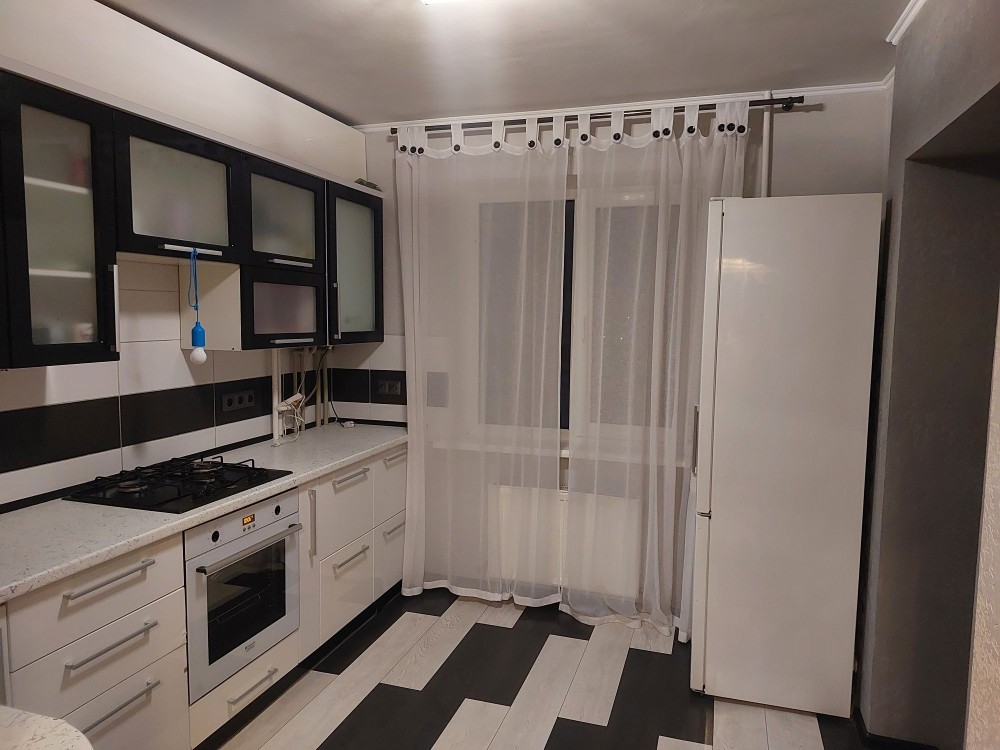 Раздельный санузел в современном кафеле — удобно для большой семьи. Кухня укомплектована добротным гарнитуром с рабочей поверхностью и встроенной техникой — остаётся новым владельцам.