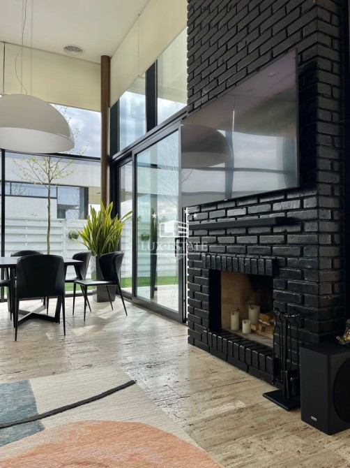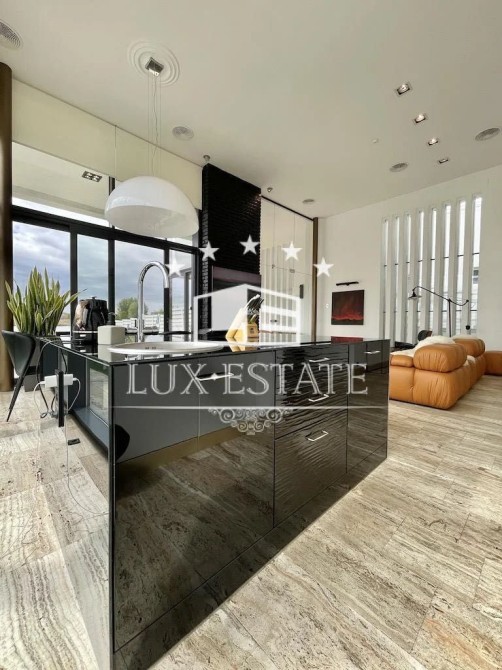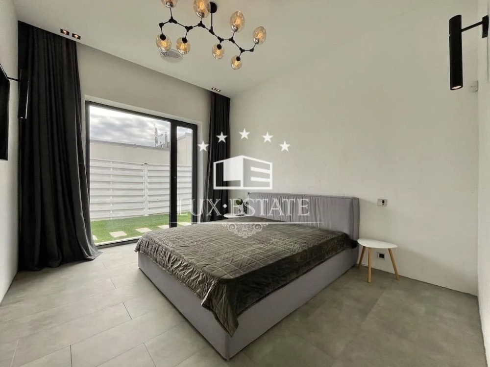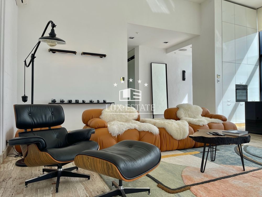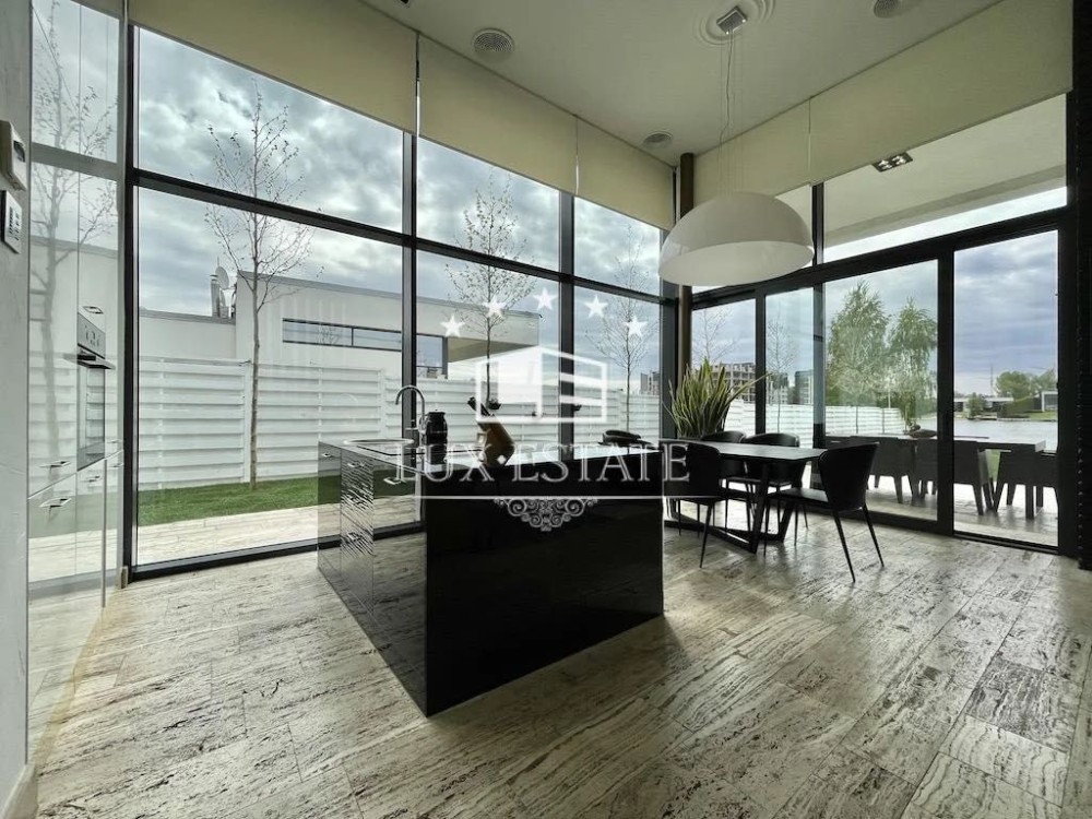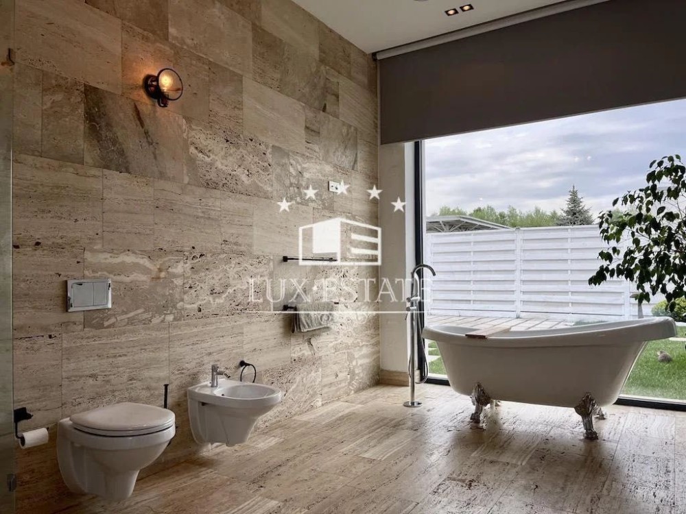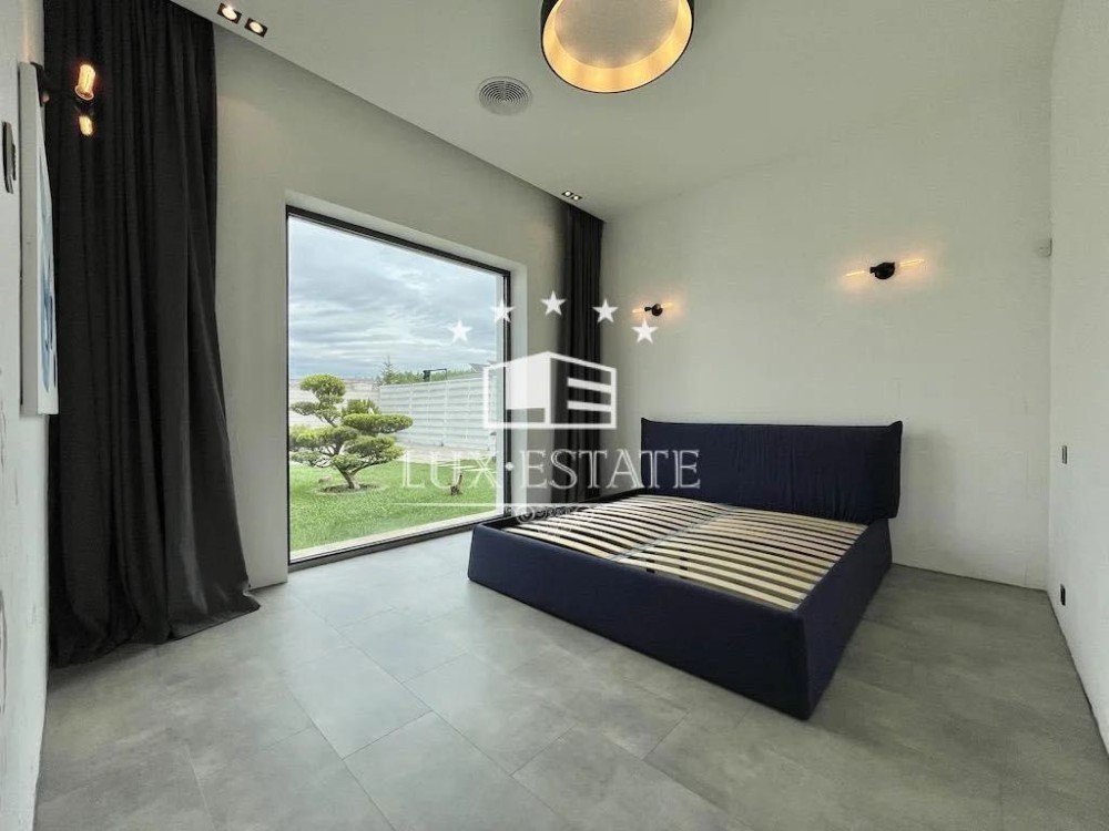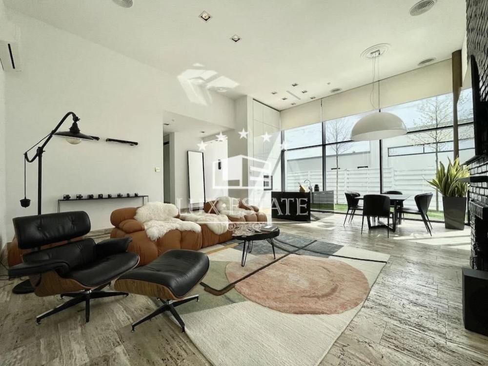 Кухня-гостиная с потолками 4 метра — простор и свет в каждом метре, мастер-спальня с собственной ванной и гардеробной, ещё две отдельные спальни, кабинет (или комната для отдыха), два санузла, технические помещения. Дом полностью меблирован и готов к проживанию.