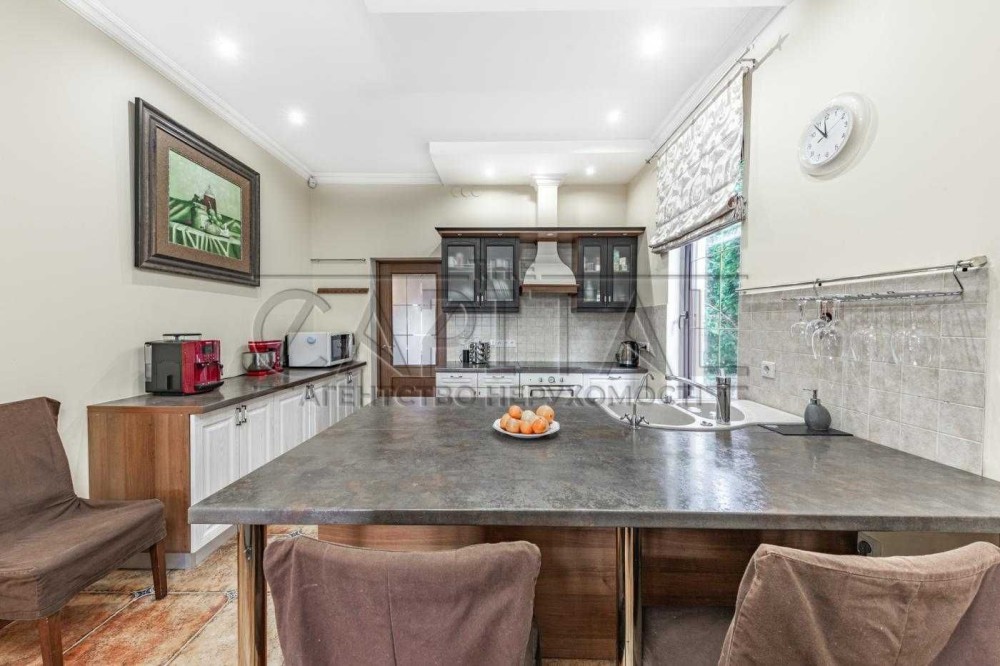 Перший поверх зустрічає хол, простора зона кухні-їдальні, що переходить у велику вітальню з діючим каміном, а також з виходом на внутрішню криту терасу. На другому поверсі дві окремі дитячі спальні, кабінет та майстер-спальня. Гараж на два авто, з автоматичними воротами також розташований у будинку.