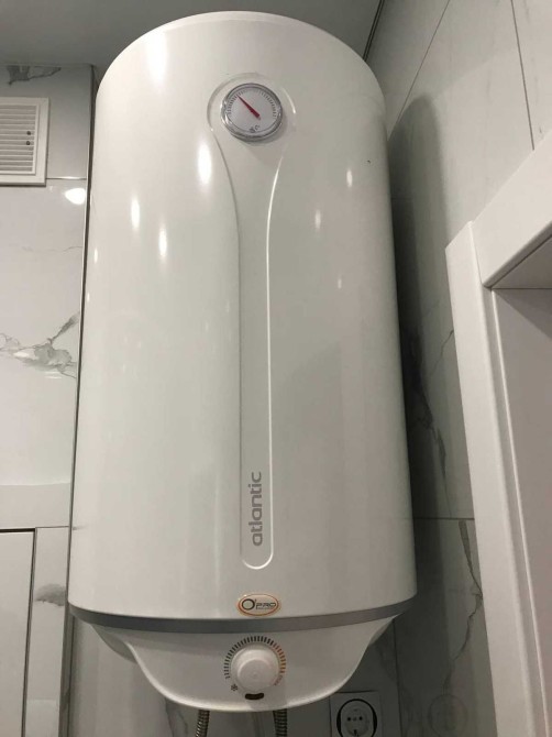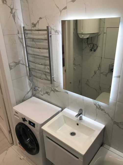 Санвузол суміщений: ванна, пральна машина, бойлер, сучасна сантехніка.