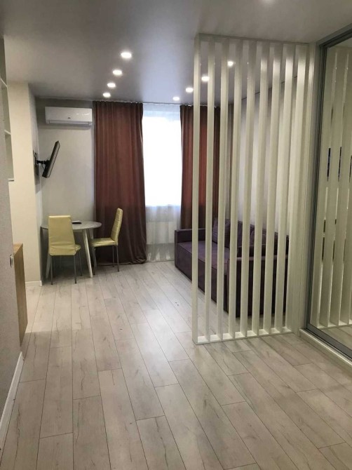 Кімната-студія із розкладним диваном, робочою/обідньою зоною (стіл, стільці, телевізор, кондиціонер).
