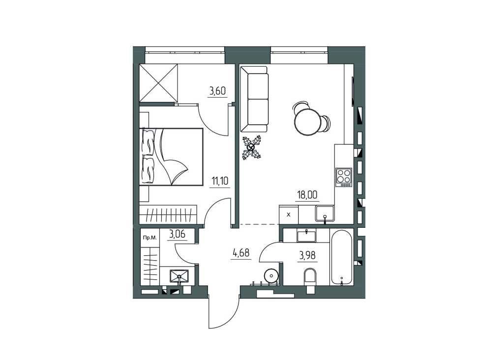 Простора 1-кім квартира 44.4м2 в Новобудові