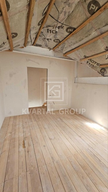 Квартира дворівнева. На першому поверсі розташована простора кухня-студія площею 37 м², санвузол, а також два виходи на великий незасклений балкон. Другий поверх включає дві кімнати (одна з яких має власну гардеробну) та другий санвузол. Зверніть увагу: площа прорахована до висоти по скосам до 1.20 м.