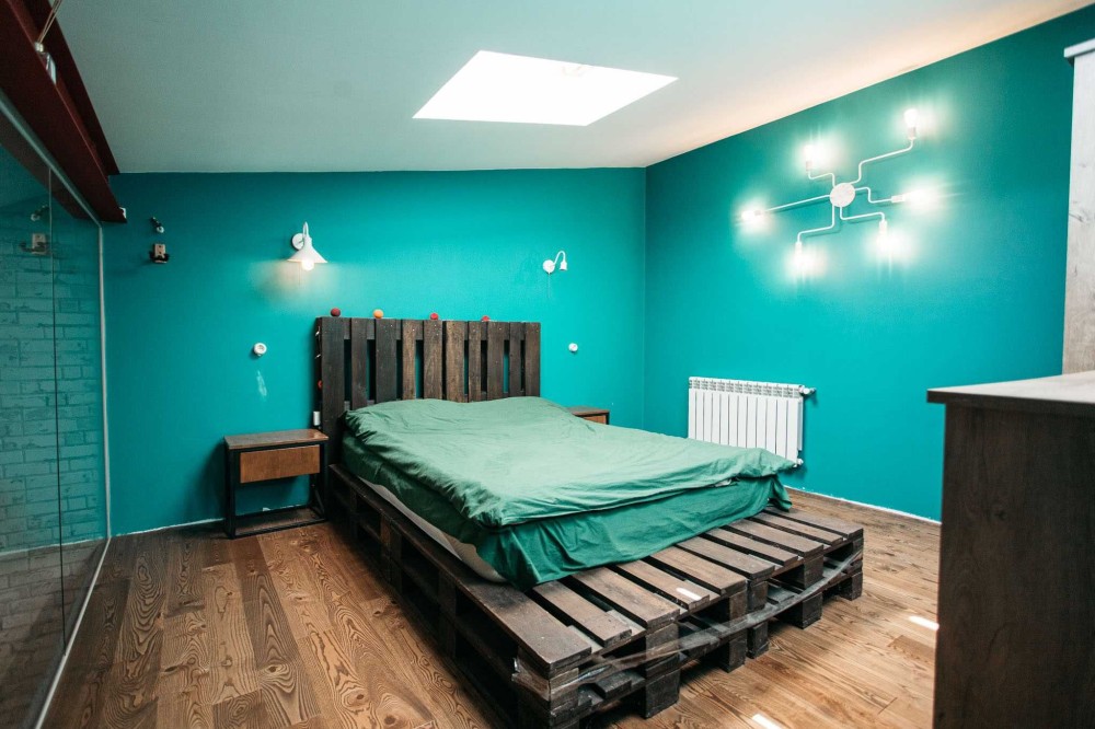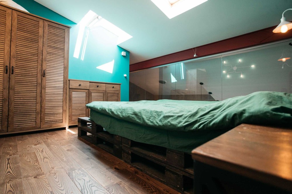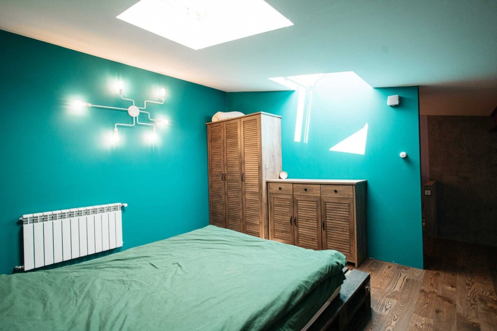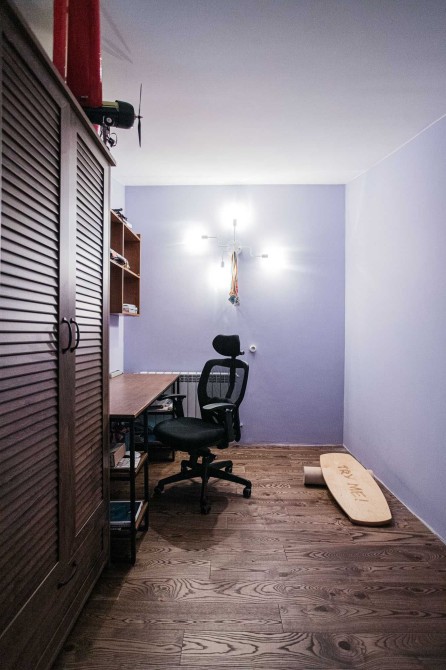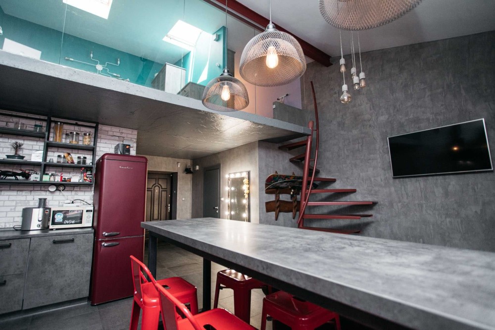 - Площа: Перший рівень – 42,5 кв.м (кухня-вітальня), другий рівень – 22 кв.м (спальня та кабінет).
