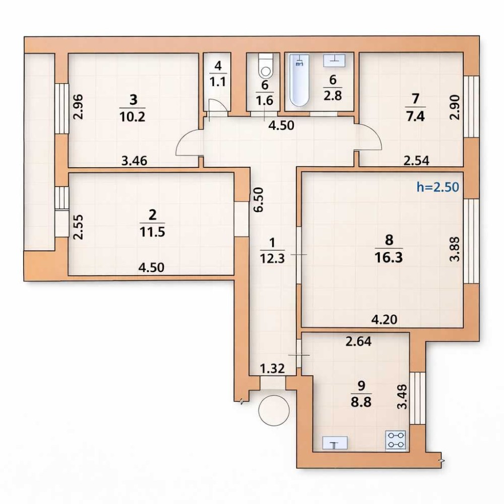 • Площа кухні 9 м2