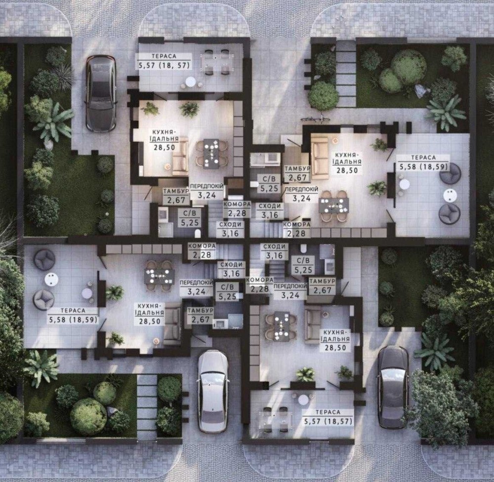 Пропонується до продажу сучасний квадрохаус площею 119 м² у котеджному містечку "Family Park Residence". Це закрита територія з охороною 24/7, власною керуючою компанією, чистими вулицями та впорядкованим простором.
