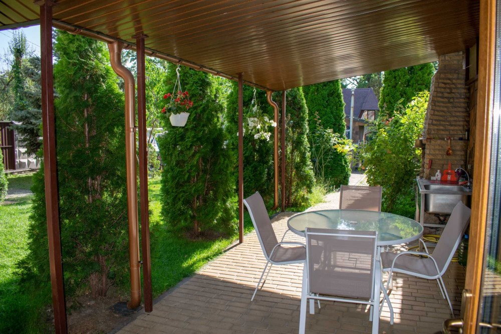 На доглянутій ділянці з літньою терасою та грилем.