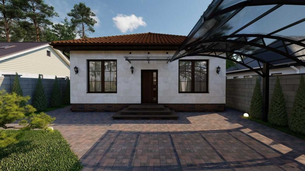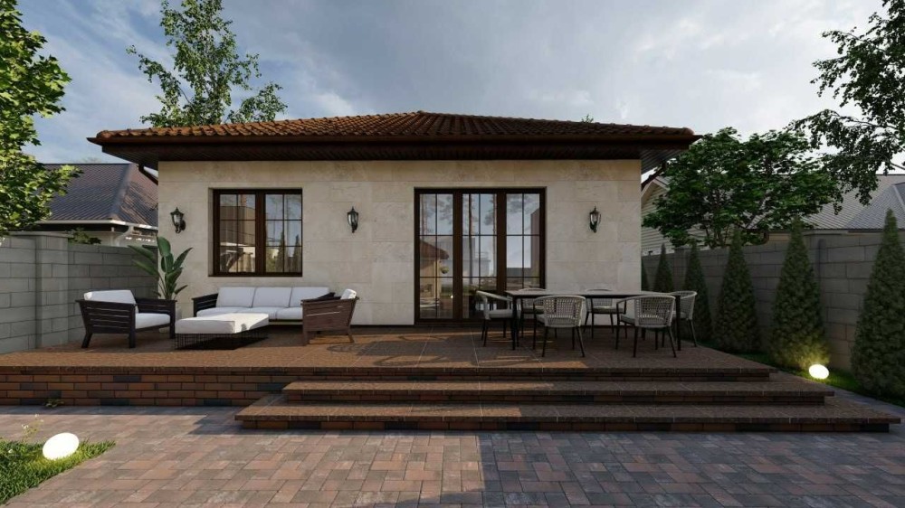 Фасад дома натуральный камень травертин + декоративная штукатурка.