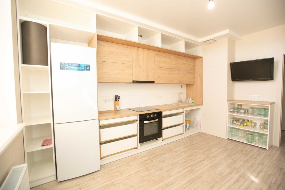 Вбудована якісна кухня з духовою шафою, холодильником, варильною поверхнею, та витяжкою.
