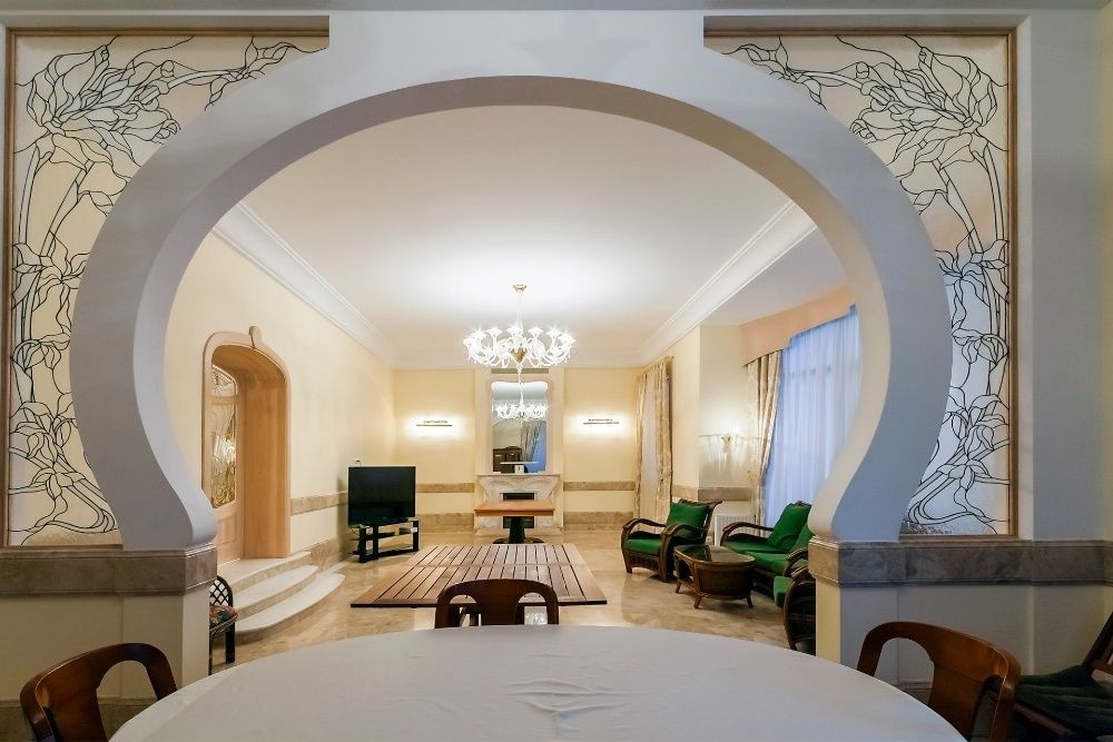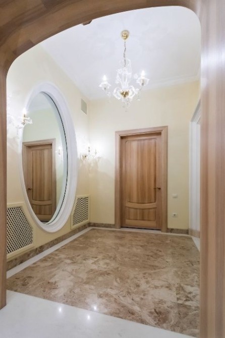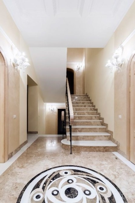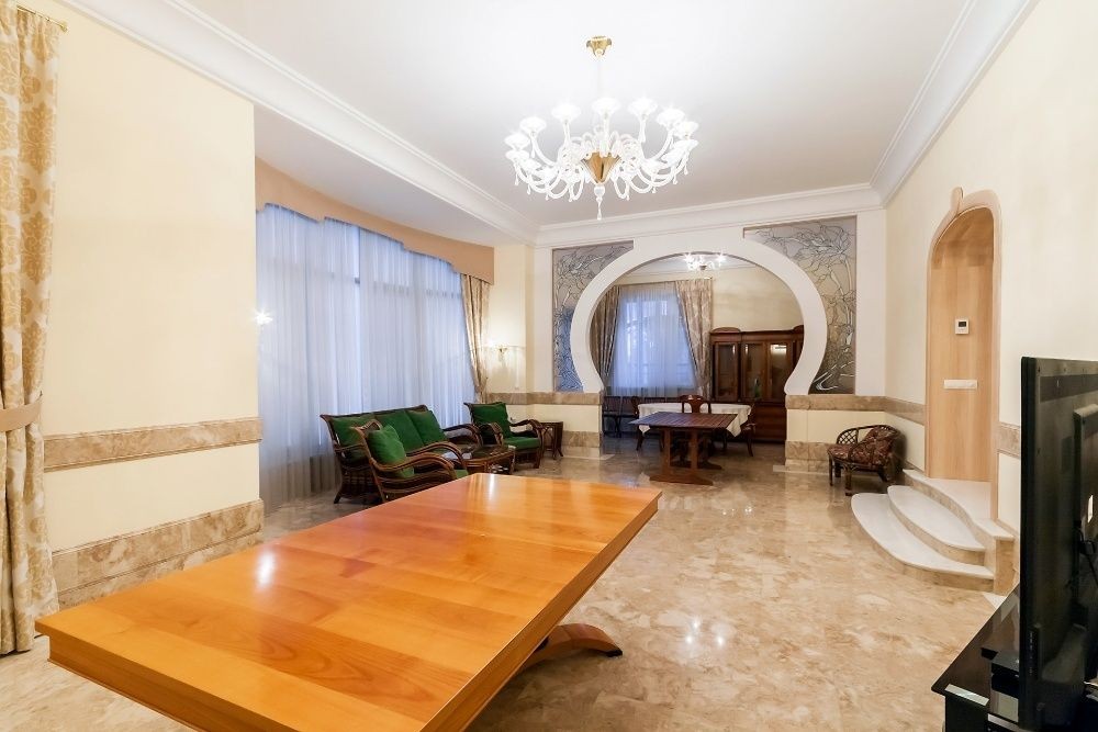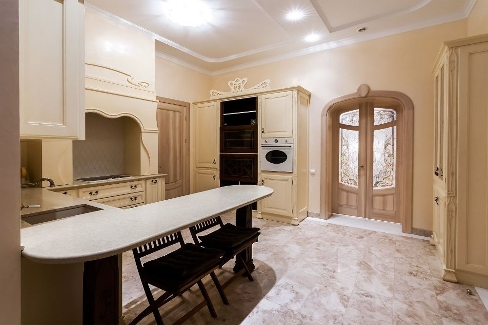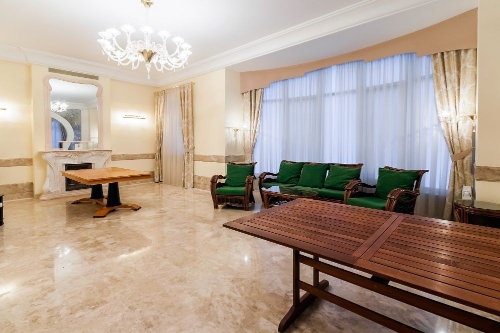 - вишуканий інтер'єр в стилі сучасної класики, в інтер'єрі використані цінні породи деревини, мрамор;