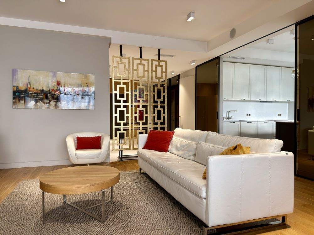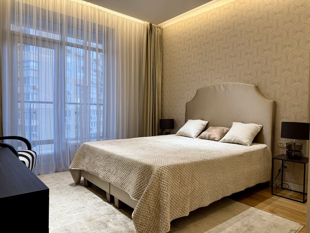 Квартира має велику вітальню з кухнею, спальню, багатофункціональну кімнату (кабінет, дитяча або гостьова), два санвузли, пральню, гардеробну та два відкриті балкони. Повністю укомплектована меблями й побутовою технікою, обладнана центральною системою кондиціювання.