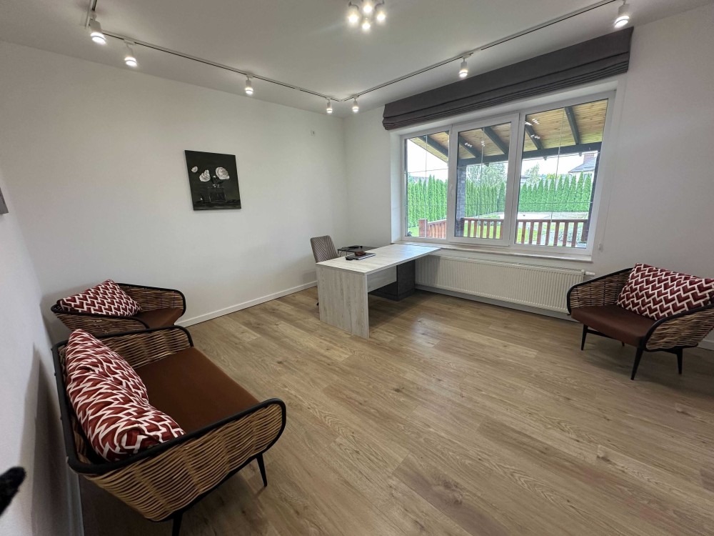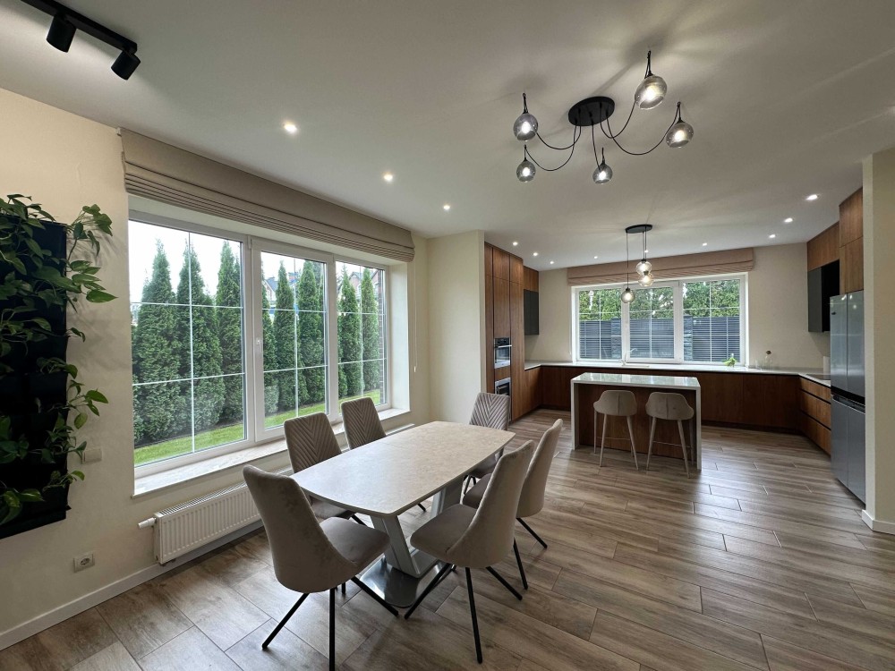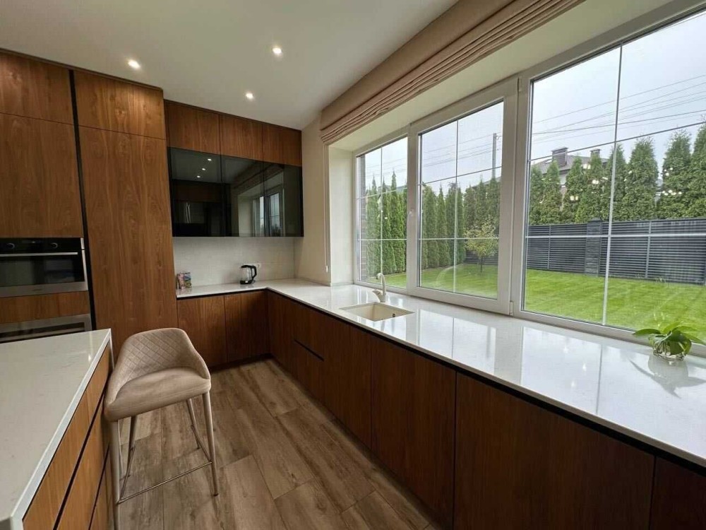На першому поверсі розташована велика, світла вітальня з виходом на терасу та у двір, сучасна і функціональна кухня з якісною технікою,робочий кабінет, гостьовий санвузол та технічна кімната з обладнанням яке генерує комфорт будинку.