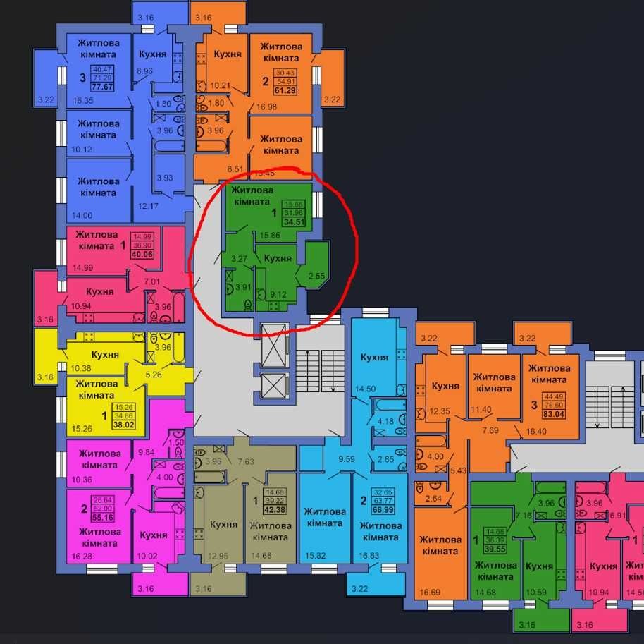 Загальна площа - 35 м², кухня - 9 м², кімната - 16 м².