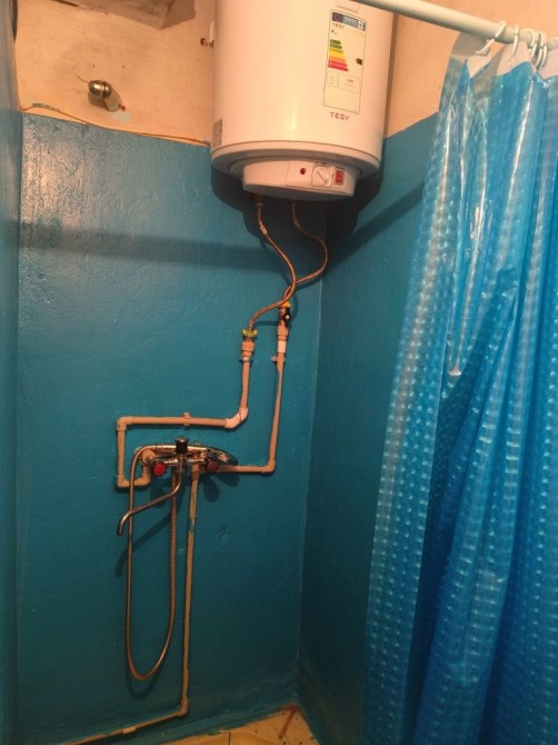 В блоке есть санузел на 4 комнаты. В санузле: умывальник, туалет, душевая. Есть бойлер (горячая вода). Есть ручная стиральная машинка типа "Малютка".