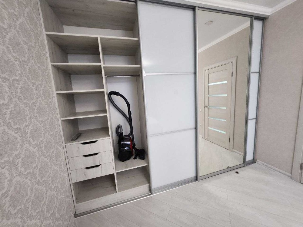 В жилой комнате — двуспальная кровать, телевизор, большой шкаф-купе и дополнительный встроенный шкаф для хранения. Из бытовой техники также есть пылесос и сушилка, по квартире проведён интернет и установлен Wi-Fi роутер. Санузел совмещённый, в ванной комнате установлены бойлер и стиральная машина.