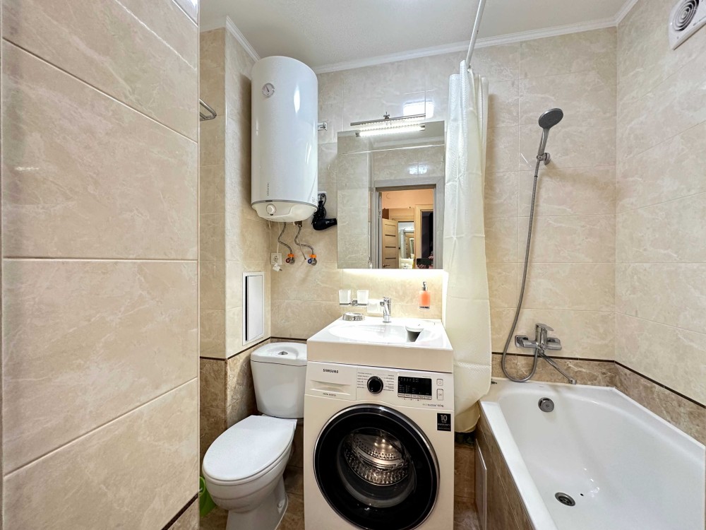 Встроенная кухня, кухонный стол, стиральная машина, бойлер, электрочайник, газоваяплита+духовка, холодильник, комод, диван, телевизор плазма, шкаф-купе, балкон застеклен, вся бытовая техника, качественная сантехника, ванна, TV кабельное+интернет, роутер.