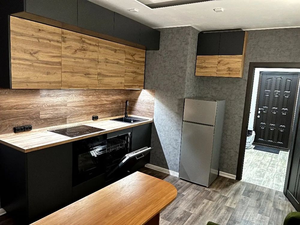 Просторная кухня со всей необходимой встроенной техникой, включая духовой шкаф, посудомоечную машину, и диваном.