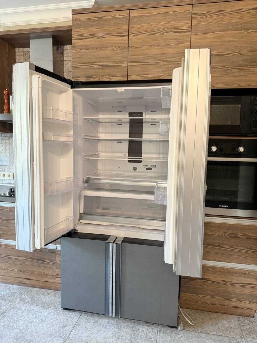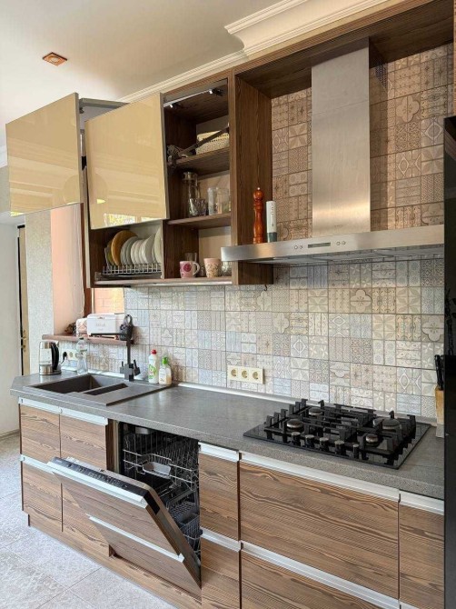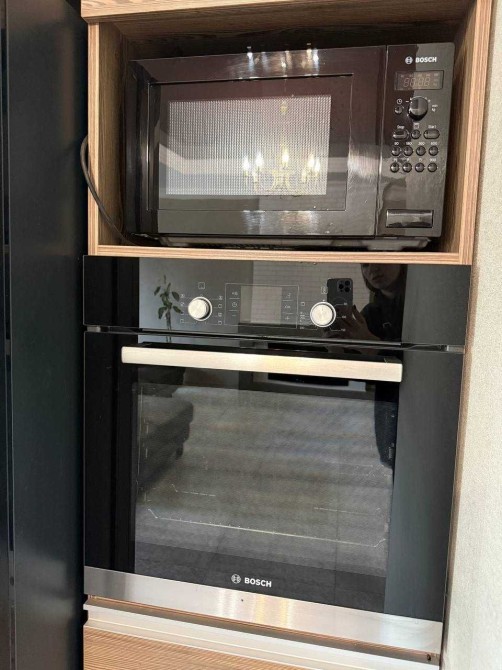 На кухне: посудомоечная машина, духовой шкаф, плита, холодильник, микроволновка, кофемашина, вся необходимая техника.