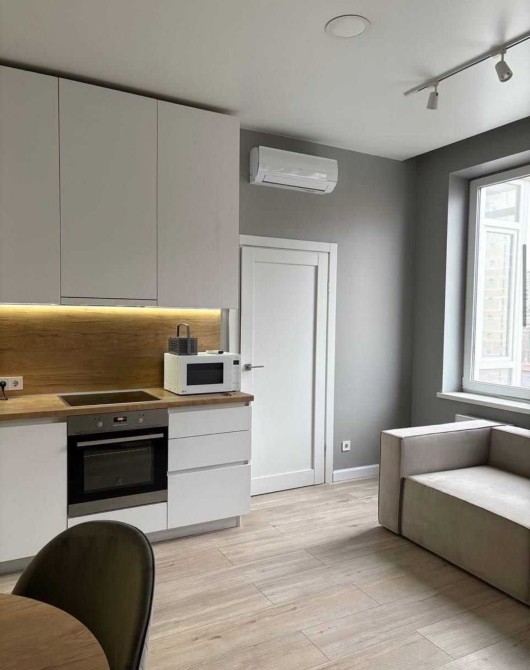Сучасна квартира з функціональним плануванням, що включає простору кухню-студію та окрему спальню. Квартира має панорамне скління, що наповнює простір природним світлом і створює відчуття простору.