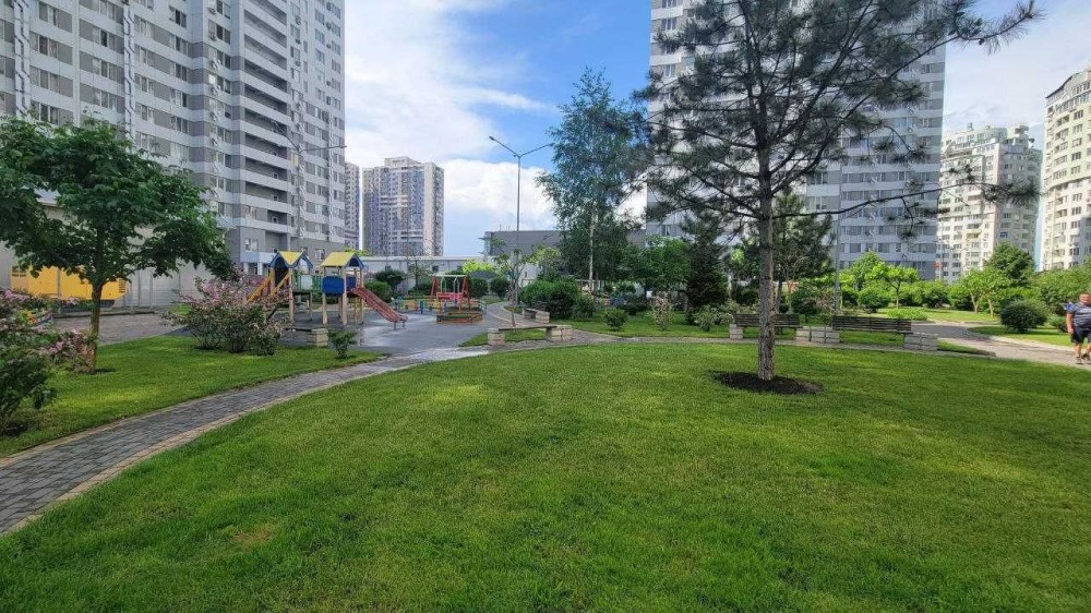 У комплекса закрытая охраняемая территория, есть большое количество магазинов, фитнес-клуб, футбольное поле, салоны красоты.