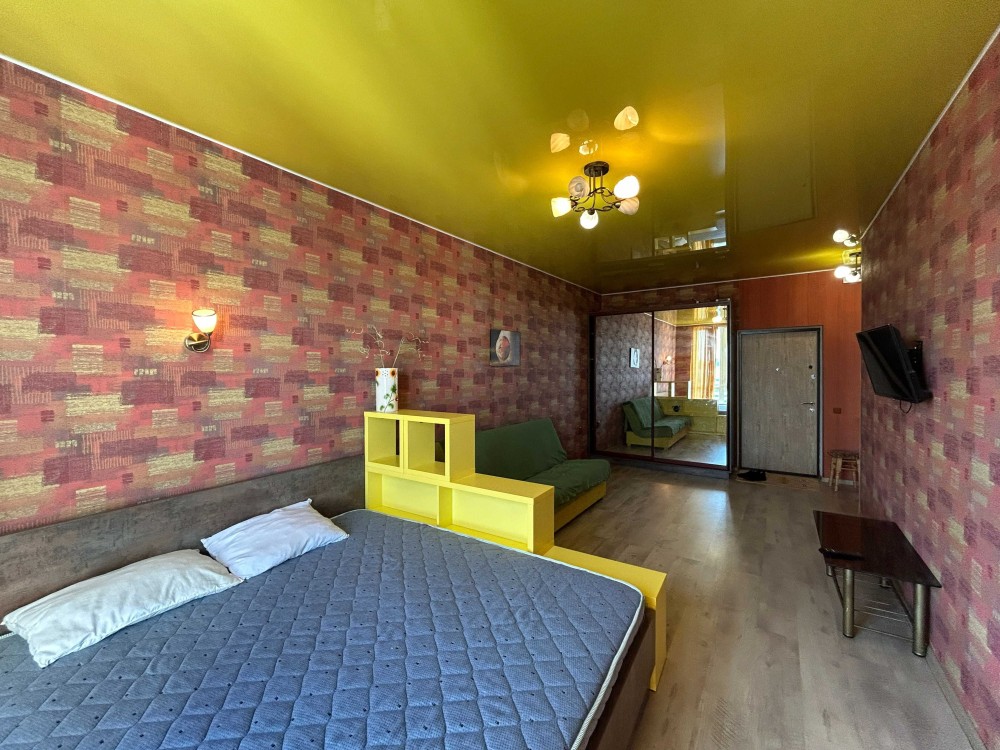 Комната разделена на две зоны: зона гостиной с диваном и спальня с двухспальной кроватью.