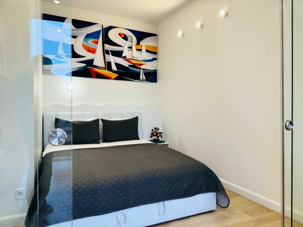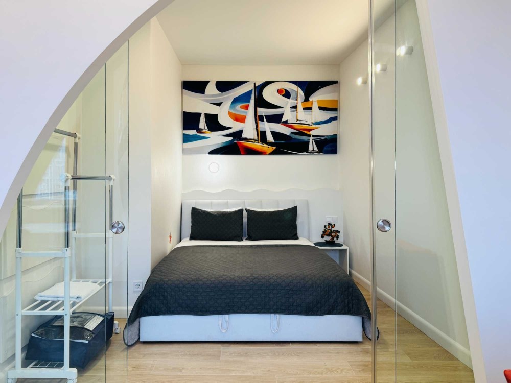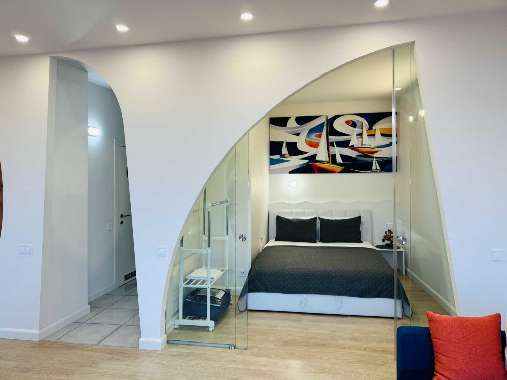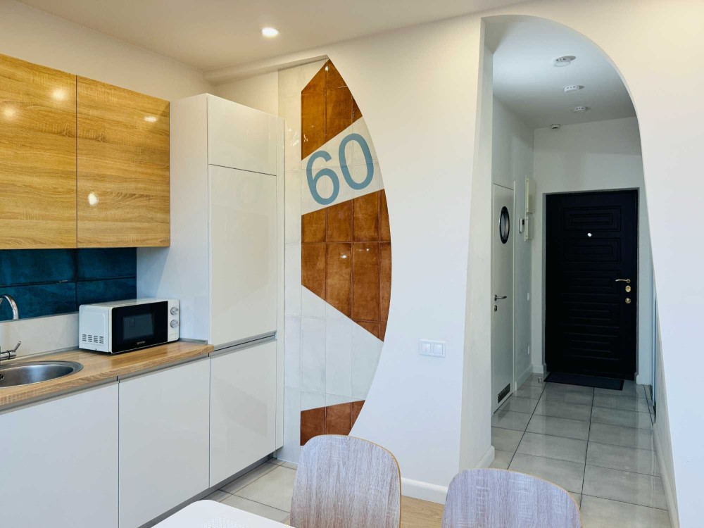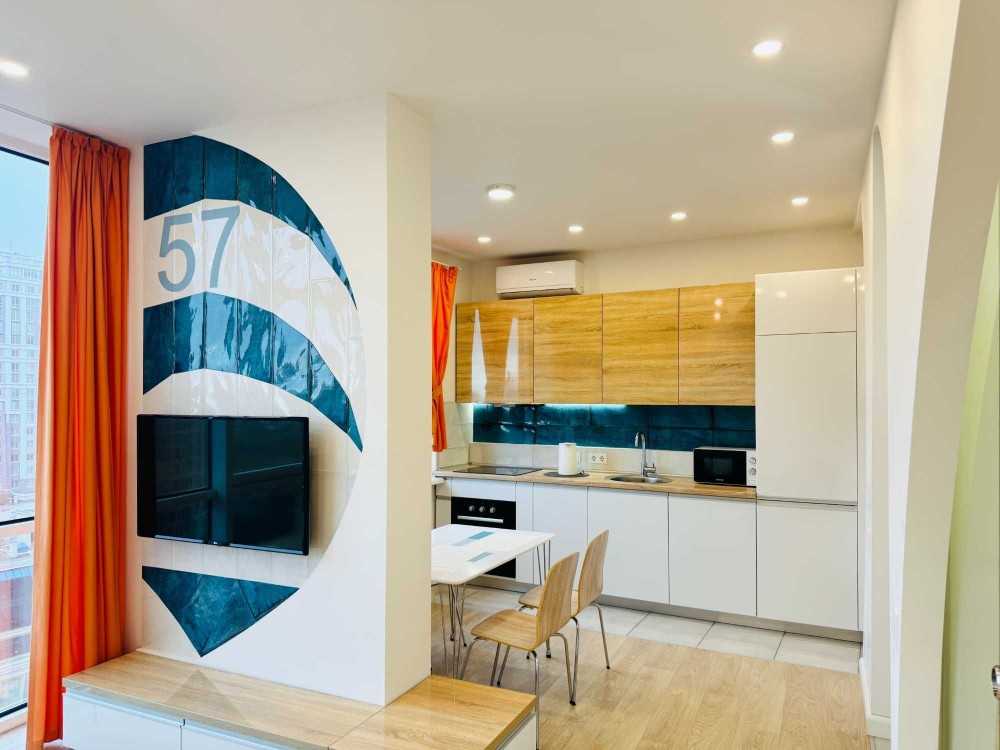 Планировка - студия с отдельной спальней. В доме есть двухэтажный подземный паркинг. Генератор. Охрана.