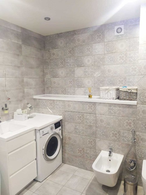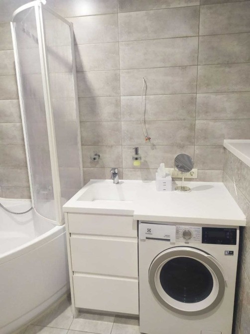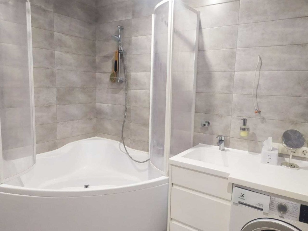 - большая ванная комната, где расположенная огромная угловая ванна, унитаз с инсталляцией, биде, объемный бойлер на 100 литров, которого хватит на большую семью, полы с подогревом, практичный полотенцесушитель, стиральная машина автомат, встроенная мебель для предметов личной гигиены.