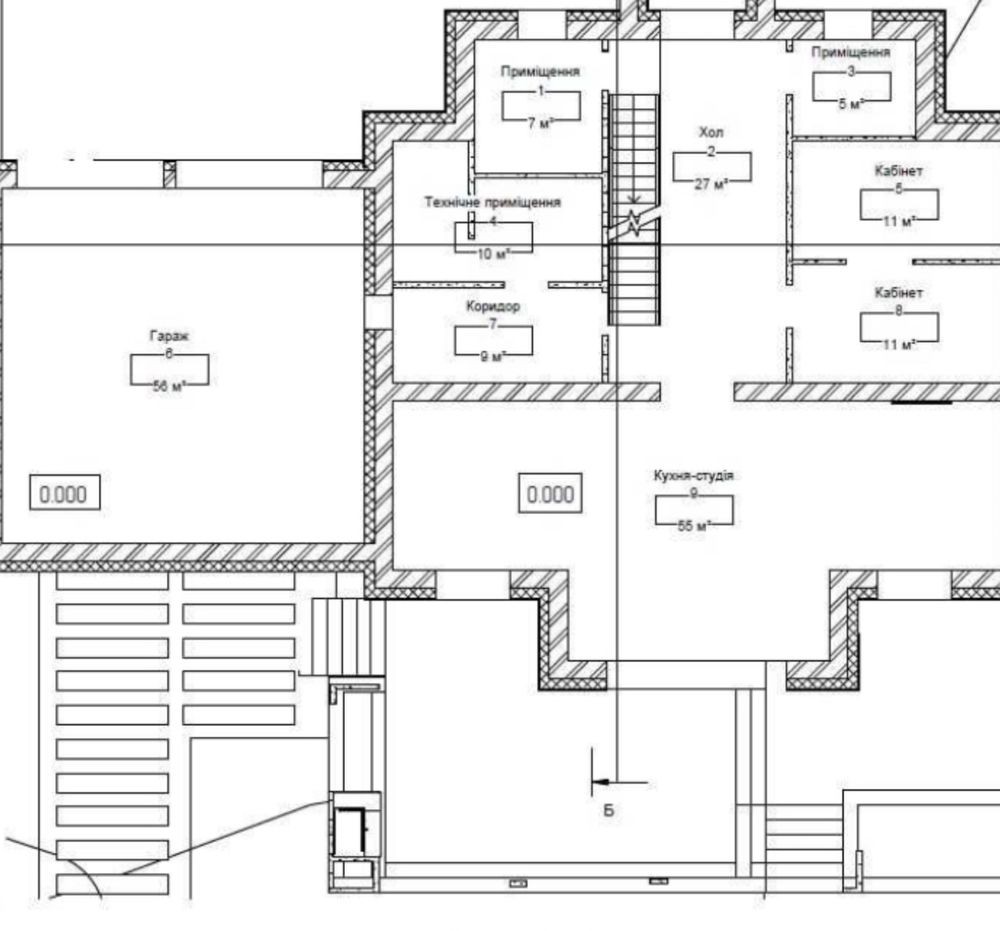 Планування: 1й поверх, гараж на 2 авто, вхідний хол, тех приміщення, с/у, гардероб, 2 невеличких кабінети або одна велика кімната, кухня вітальня, тераса.