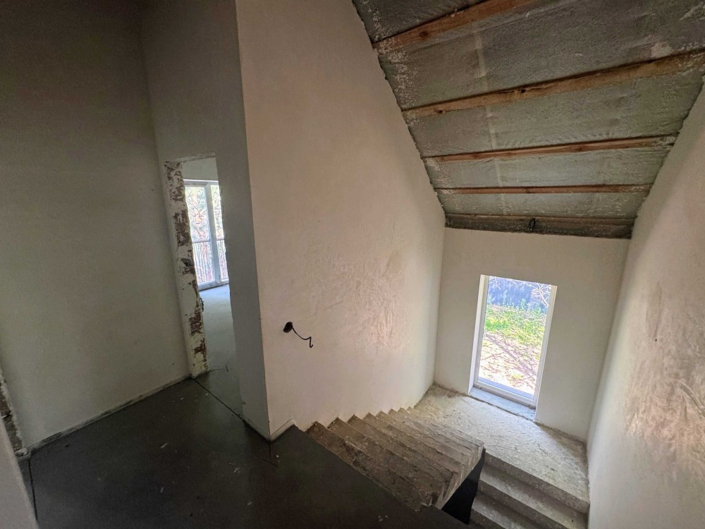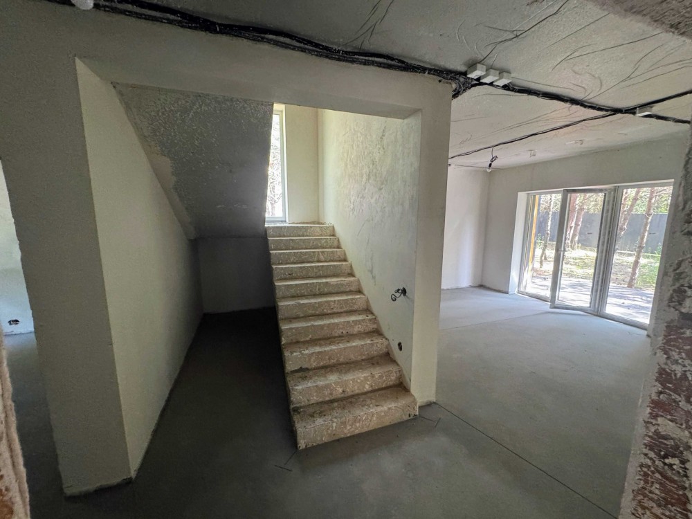 Будинок зведений на міцному стрічковому фундаменті, стіни виконані з надійного керамоблоку завтовшки 380 мм, а міжкімнатні перегородки — із цегли 120 мм. Залізобетонні перекриття та сходи гарантують довговічність конструкції. Утеплення даху мінеральною ватою 200 мм та фасаду пінопластом 100 мм забезпечує комфортний мікроклімат у будь-яку пору року. Двокамерні енергозберігаючі вікна додають затишку, а стіни підготовлені до чистової обробки, готові стати основою вашого ідеального інтер’єру.