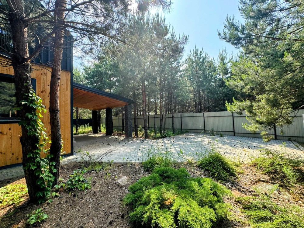 Територія навколо будинку також створена для вашого комфорту. Доріжки з декоративної плитки, зручне паркомісце з навісом, зона барбекю та місце відпочинку під навісом, освітлення, яке додає шарму в вечірній час, і навіть мальовничі сосни, що дарують прохолоду й аромат свіжості.