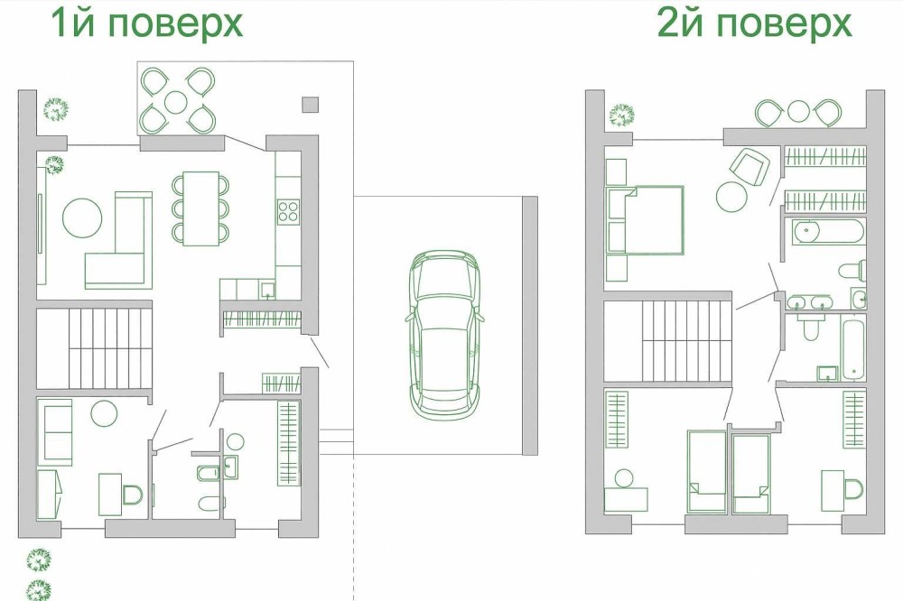 Планування будинку продумане до дрібниць. На двох поверхах розташовані 4 затишні спальні, 3 стильні санвузли, простора кухня-вітальня, гардеробна кімната й чарівна тераса, де можна насолоджуватися видами на сосновий ліс.