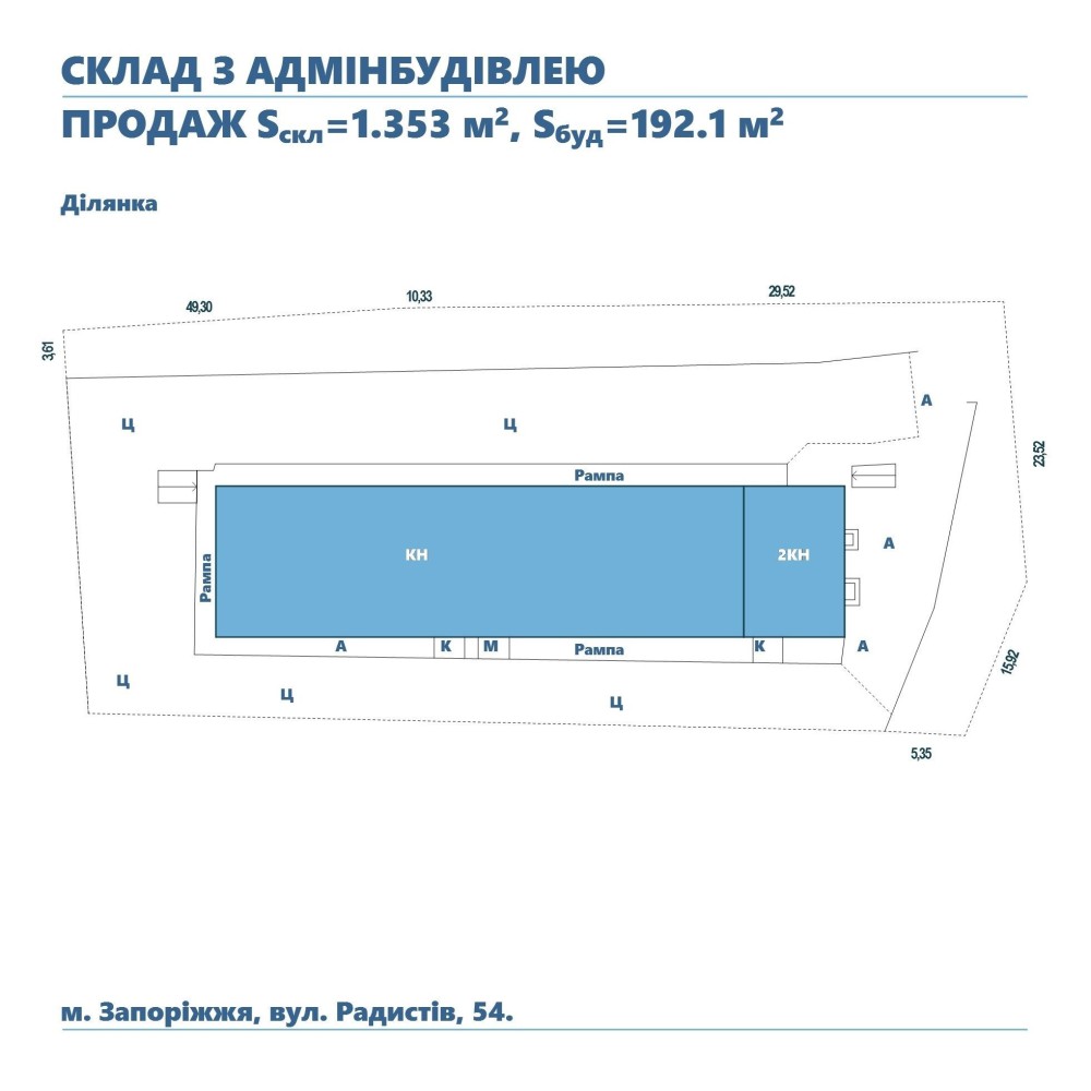 – Загальна площа складу: 1 353 м² (1-й поверх та підвал).