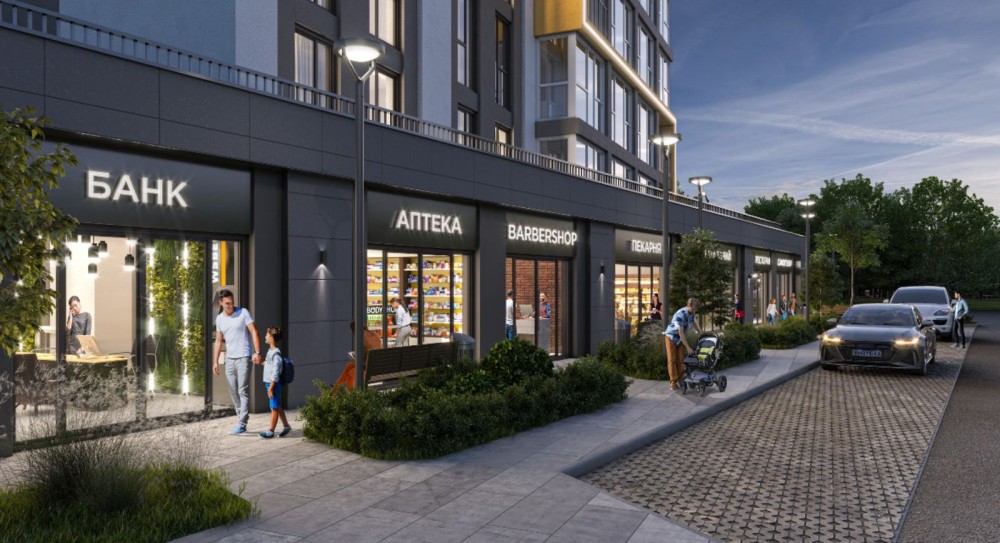 Закрытый двор. Охрана. Подземный паркинг. Во дворе – детская площадка и зоны отдыха для взрослых. На первом этаже будет детский сад, магазины,