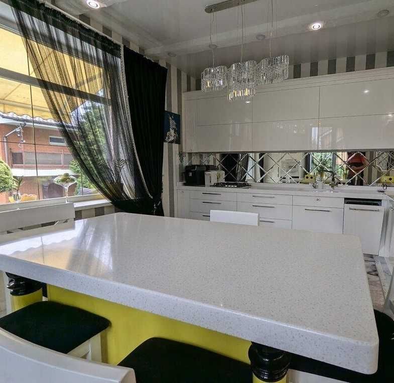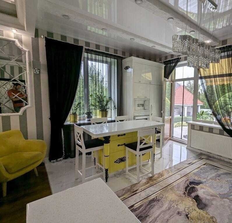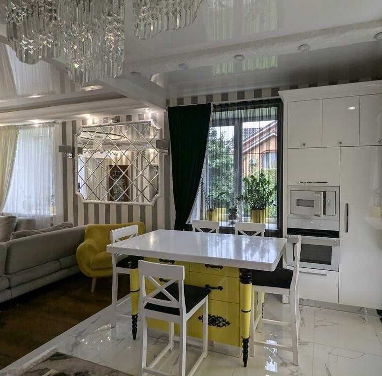Простора кухня-вітальня - 43м2, зонована. Вихід на терасу 25м Вся необхідна побутова техніка. На теплій підлозі - іспанський кахель, дубовий настил підлоги. Брендові меблі. Саунд система по будинку. Продумана кожна деталь.